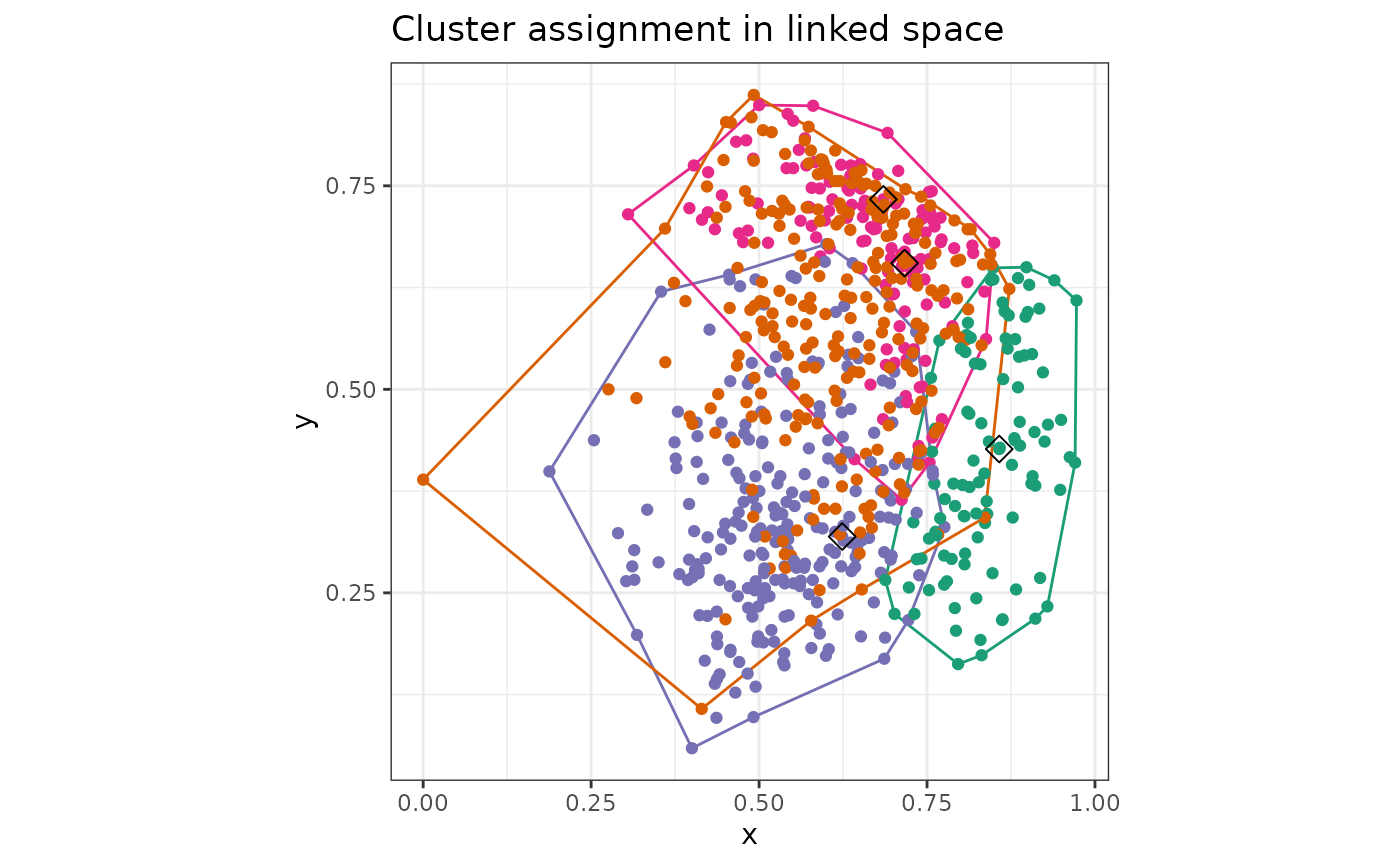 r <- makeResults(space1 = Bikes$space1, settings = list(k = 4, metric = "euclidean", linkage = "ward.D2"), cov = cov(Bikes$space1), space2 = Bikes$space2, getScore = outsideScore(Bikes$other$res, "Residual"))